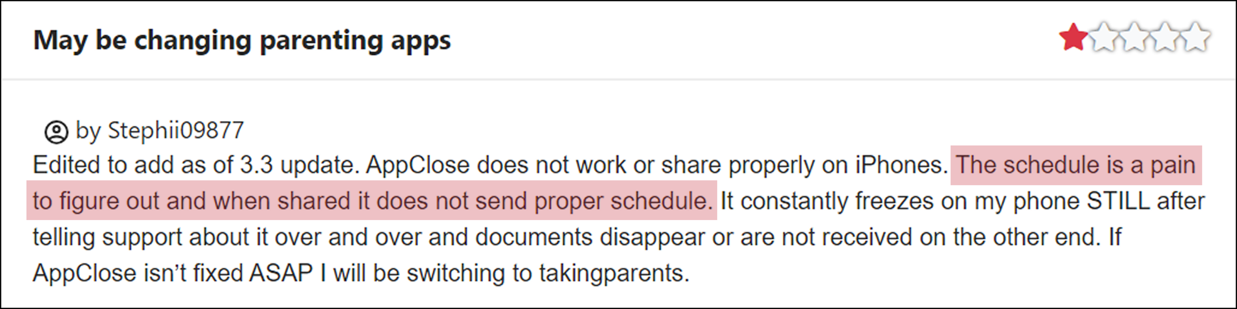 I’ve been using AppClose myself after my own high-conflict custody battle. (I told you it would be a passion product!) A big portion of the time spent on this project was simply confirming the same frustrations I felt with the app.